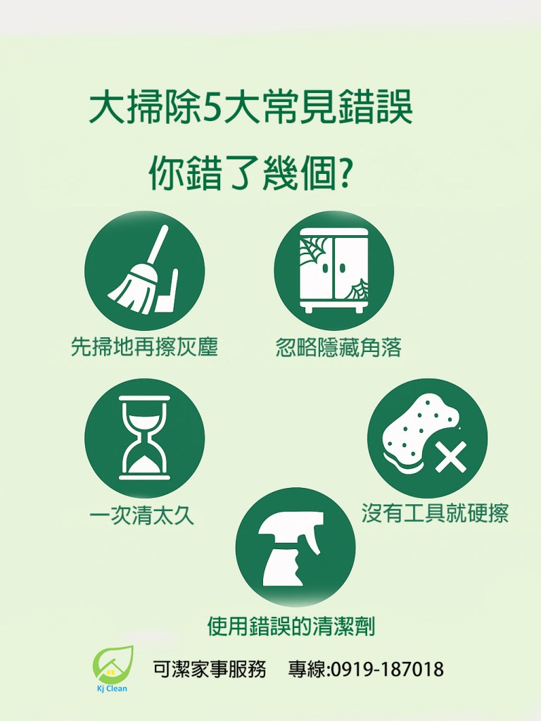 避免這些錯誤,大掃除就能省時省力。如果你希望徹底清潔又不想勞累,交給 可潔家事服務,專業管家幫你一次搞定!